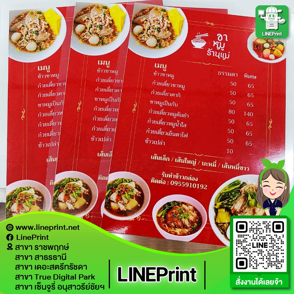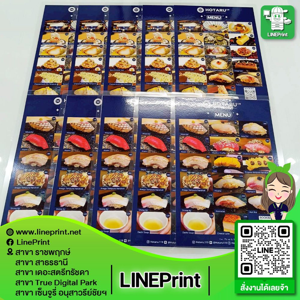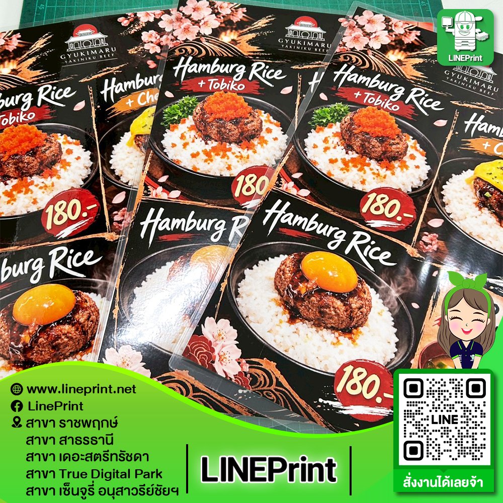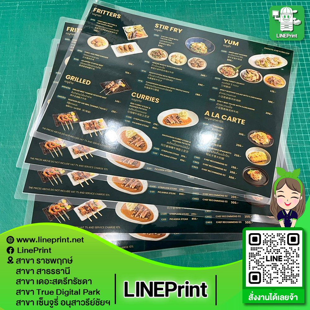 ปริ้นแล้วเคลือบพลาสติกทำให้กันน้ำ สำหรับปริ้นเมนูอาหาร ปริ้นเกียริบัตร ต้องการความทนทานกันน้ำ รูปอาหารดูสดขึ้น